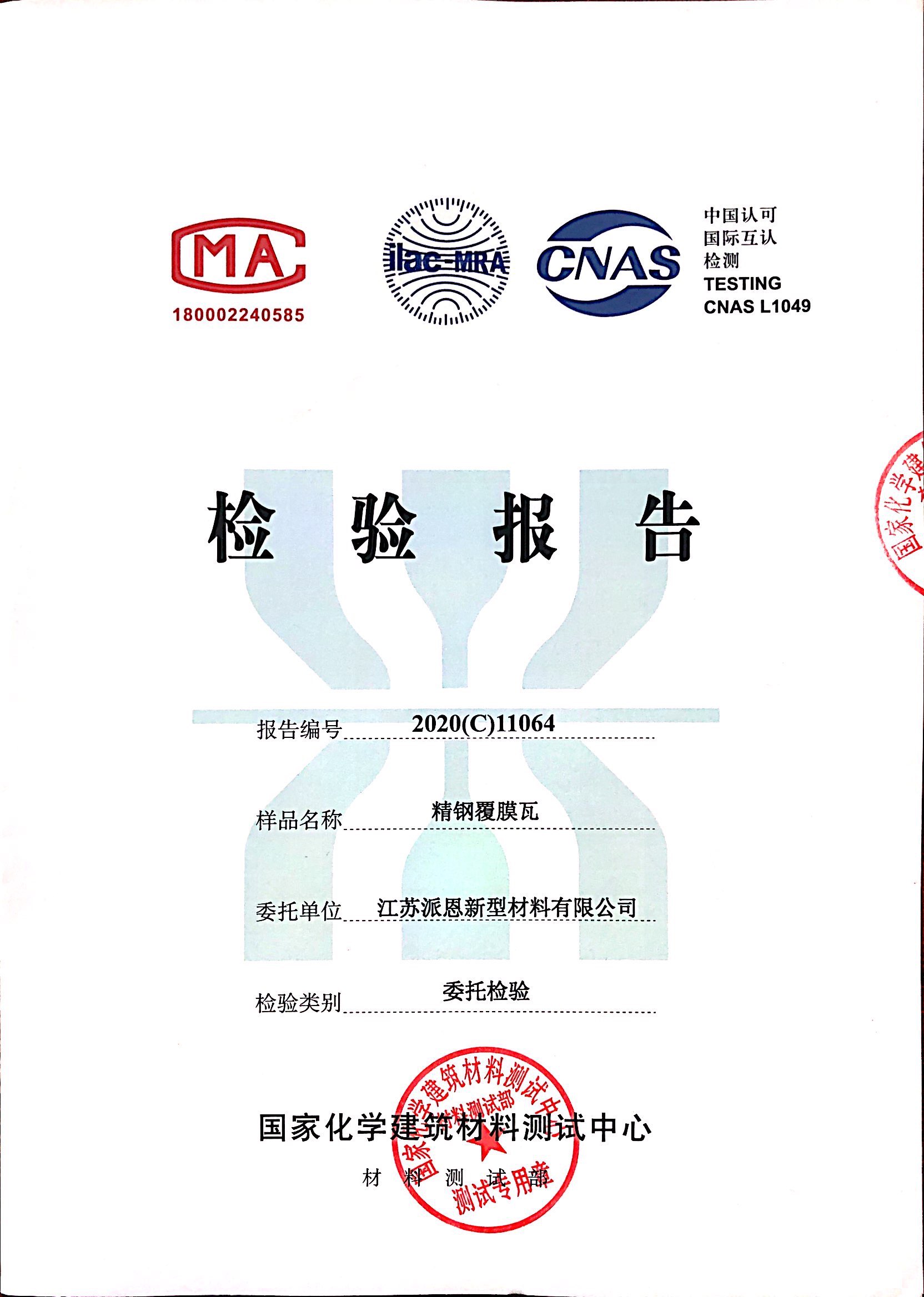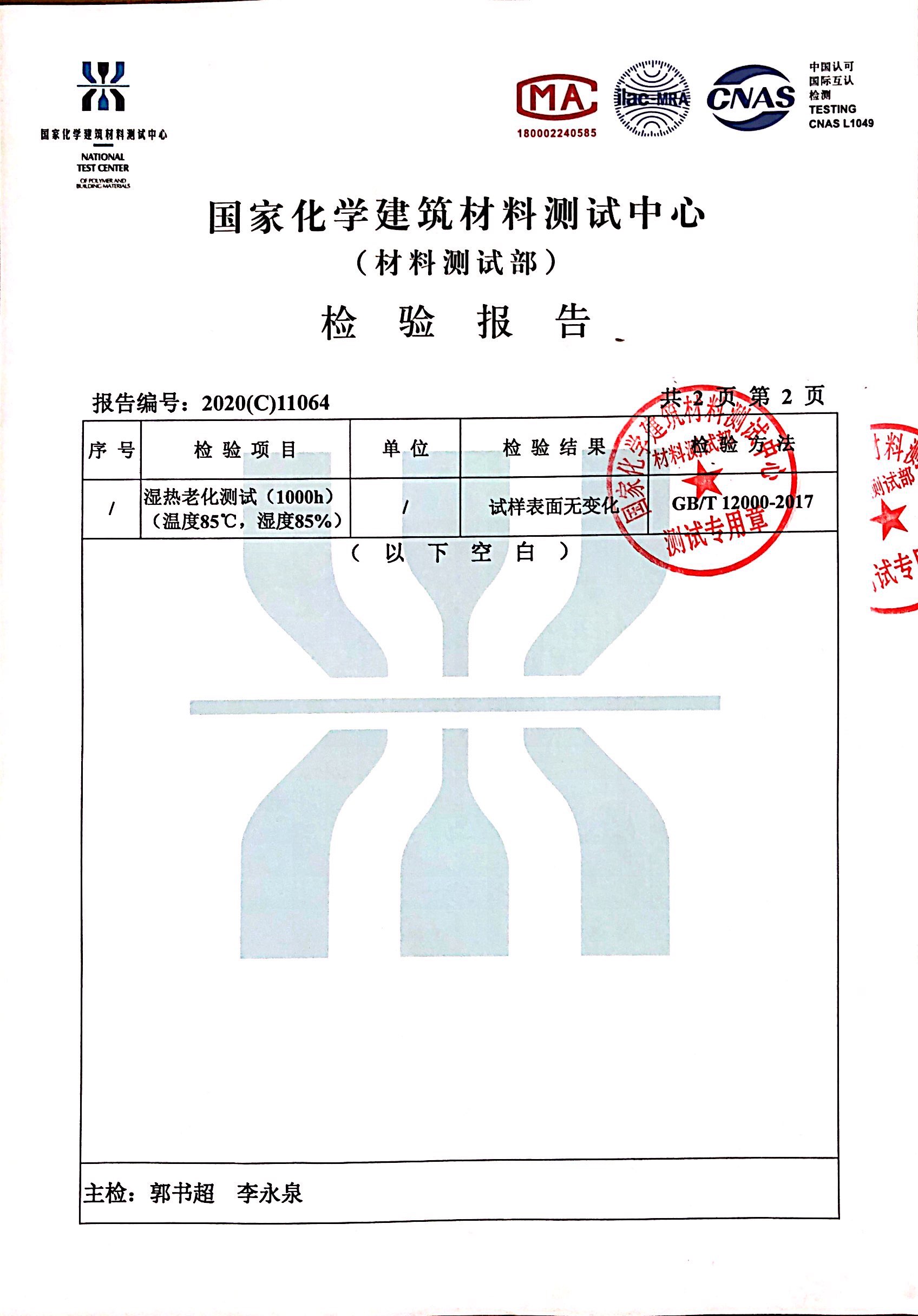 近日,我們收到了來自國家化學建筑材料中心寄來的檢測報告。
